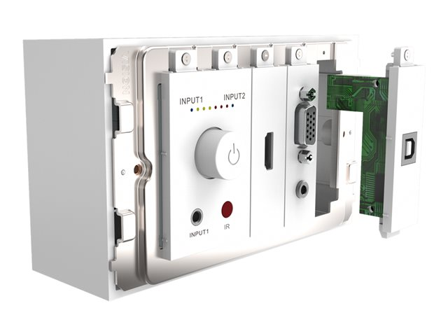 | Pakkauksen sisältö | 1 x 2-Gang UK Backbox, 1 x 2-Gang Surround, 1 x VGA minijakki snap-in -moduulilla, 1 x USB snap-in -moduuli (B-tyyppi edessä), 1 x napsautettava HDMI-moduuli, 3 tyhjää levyä |
